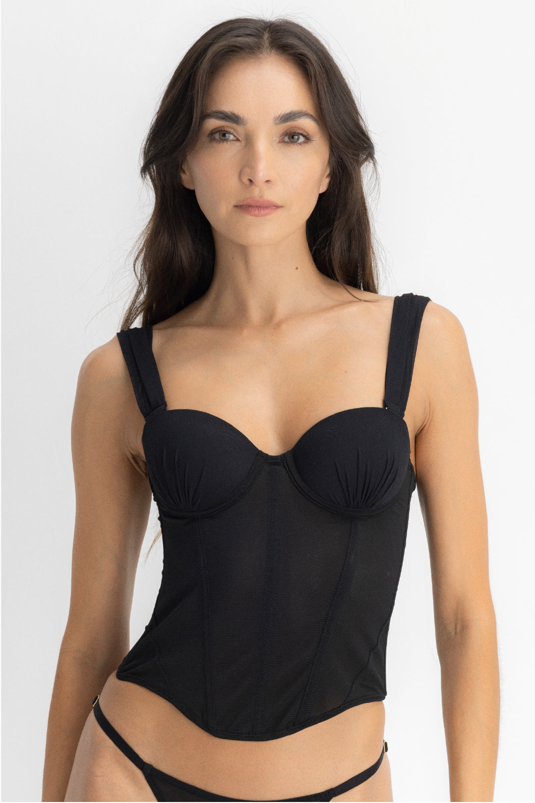 Corset Aisa, cuerpo en tull tipo powernet con control ligero. Perfecto para usar como prenda exterior y darle personalidad a tu outfit. Es strapless, con varillas tipo faja con memoria (no se deforman con el tiempo) y moldean y acentรบan la figura. Tiene copas prehormadas y arco varilla. Incluye cargaderas removibles para mayor soporte. En la parte posterior tiene ojales y cordรณn para ajustar.