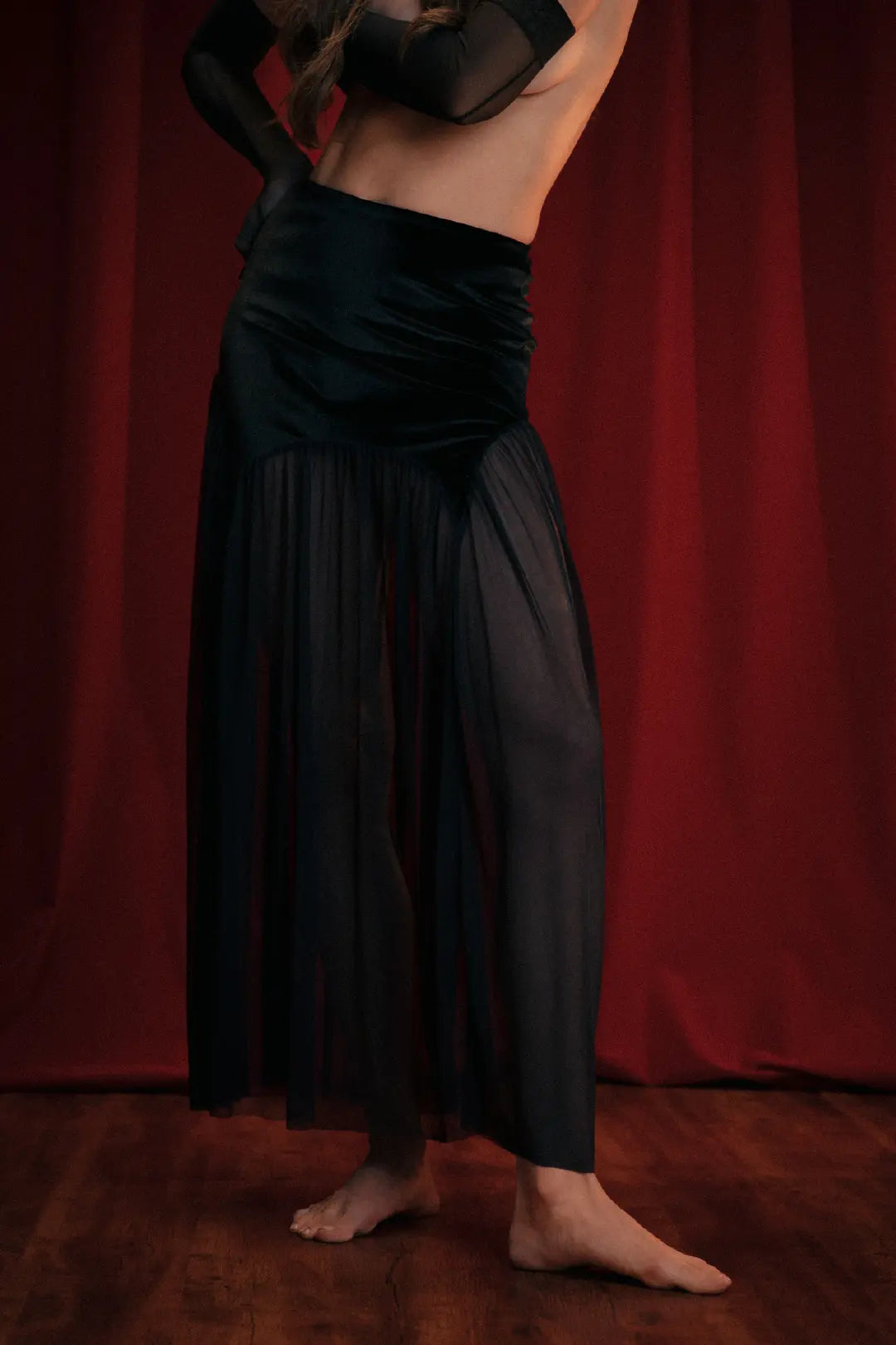 Falda larga con vuelo y delicados recogidos, confeccionada en velvetin y tul licrado. Su fit se ajusta suavemente en la cadera y se abre con movimiento hacia el ruedo, creando una silueta etérea y sofisticada. Una pieza que combina elegancia, textura y fluidez en perfecta armonía.