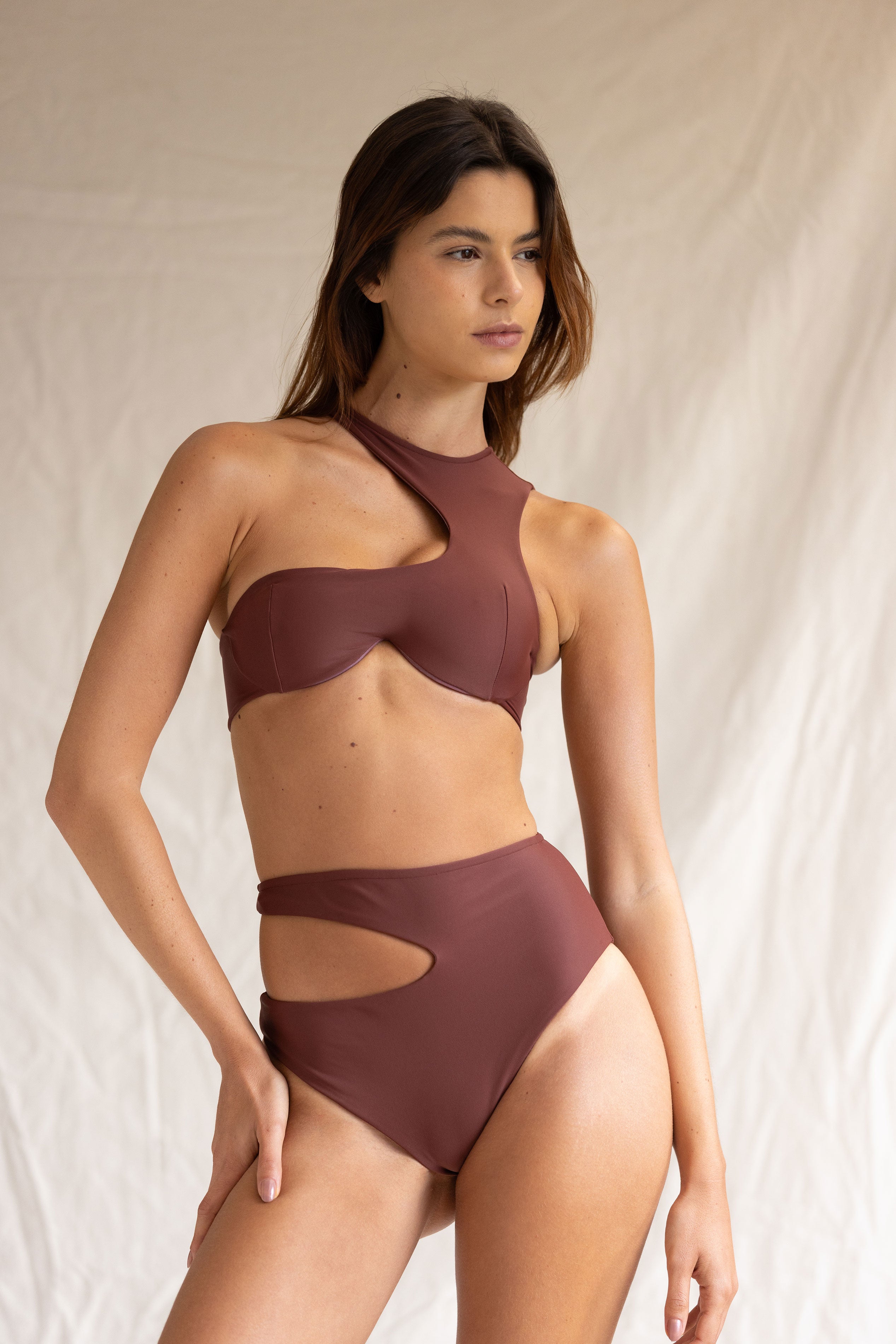 Top de traje de baño en lycra con varilla continua, su diseño es hasta el cuello con un broche y cintas para amarrar en la espalda.