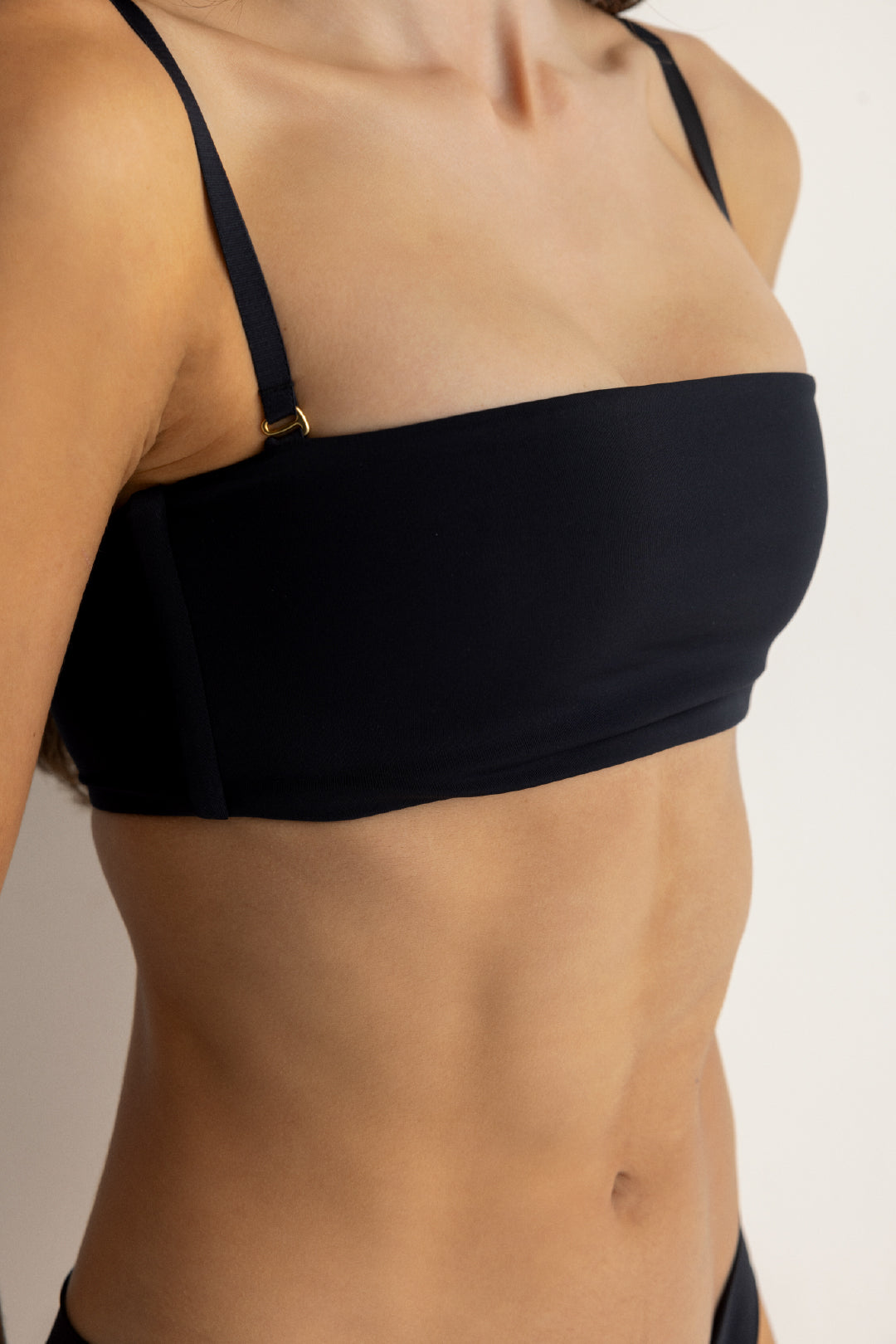 Top strapless elaborado en licra suave de tacto frío, que se adapta cómodamente al cuerpo. Diseñado con cargaderas removibles y ajustables para mayor flexibilidad, y detalles de herrajes con baño de oro que realzan su estilo elegante.